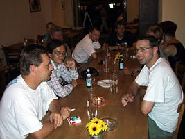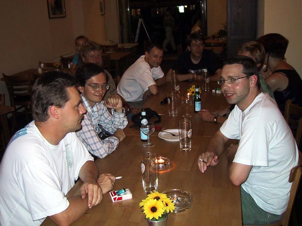 Ухватив свой автограф и тут же купив рядом с церковью новый компакт Хэммилла (What, now? - кстати, всем очень советую!) я отправился вместе с группой известных мне по e-mail-овской переписке людей в близлежащий итальянский ресторанчик. Фотки с этой встречи (а также фото с концерта) вы можете найти в Дневнике Коэна Вивермана, на этой же странице вы видите снимок, сделанный им (я - второй слева), размещаю его здесь с его любезного разрешения.