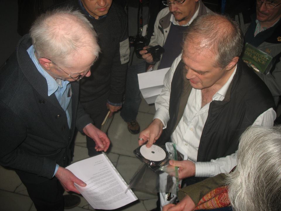 Настало время встретиться с ожидавшими его слушателями, теплившими надежды обмолвиться парой слов, получить автограф, сфотографироваться. Я же, плюс ко всему, должен был передать результат полутора лет работы нашего "клуба". И вот этот момент настал. Я стою перед этим высоким, худым, немного полысевшим пожилым человеком, глаза которого излучают все тот же живой свет, который, скорее всего, и является нашей сущностью, пытаюсь довести до него информацию о том, что это и по какому поводу я вручаю ему эти диски, делаю это коряво, что немудрено: мы все (и Питер в том числе) еще пребывали там, в зале, внимая величественному созвучию голоса и рояля. Но он любезно улыбается, кивает и под аплодисменты оставшихся друзей принимает этот презент.